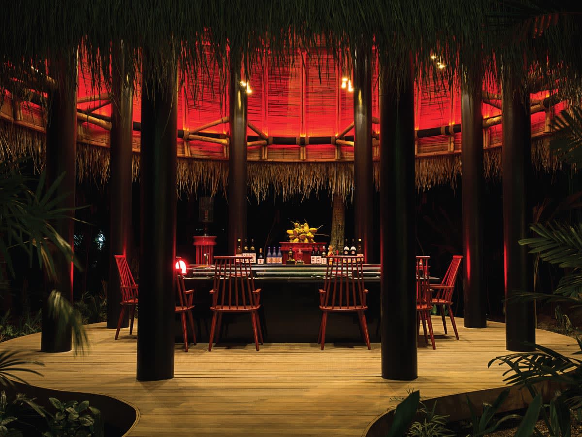 树叶在心醉神迷中微微颤抖。鸟儿的鸣叫穿透华盖。在六米高空或林地上纠缠交错的蔓藤之间探索超凡离奇的梦境。真正戏剧性的美食体验莫过于餐厅最受欢迎的日式铁板烧桌位。